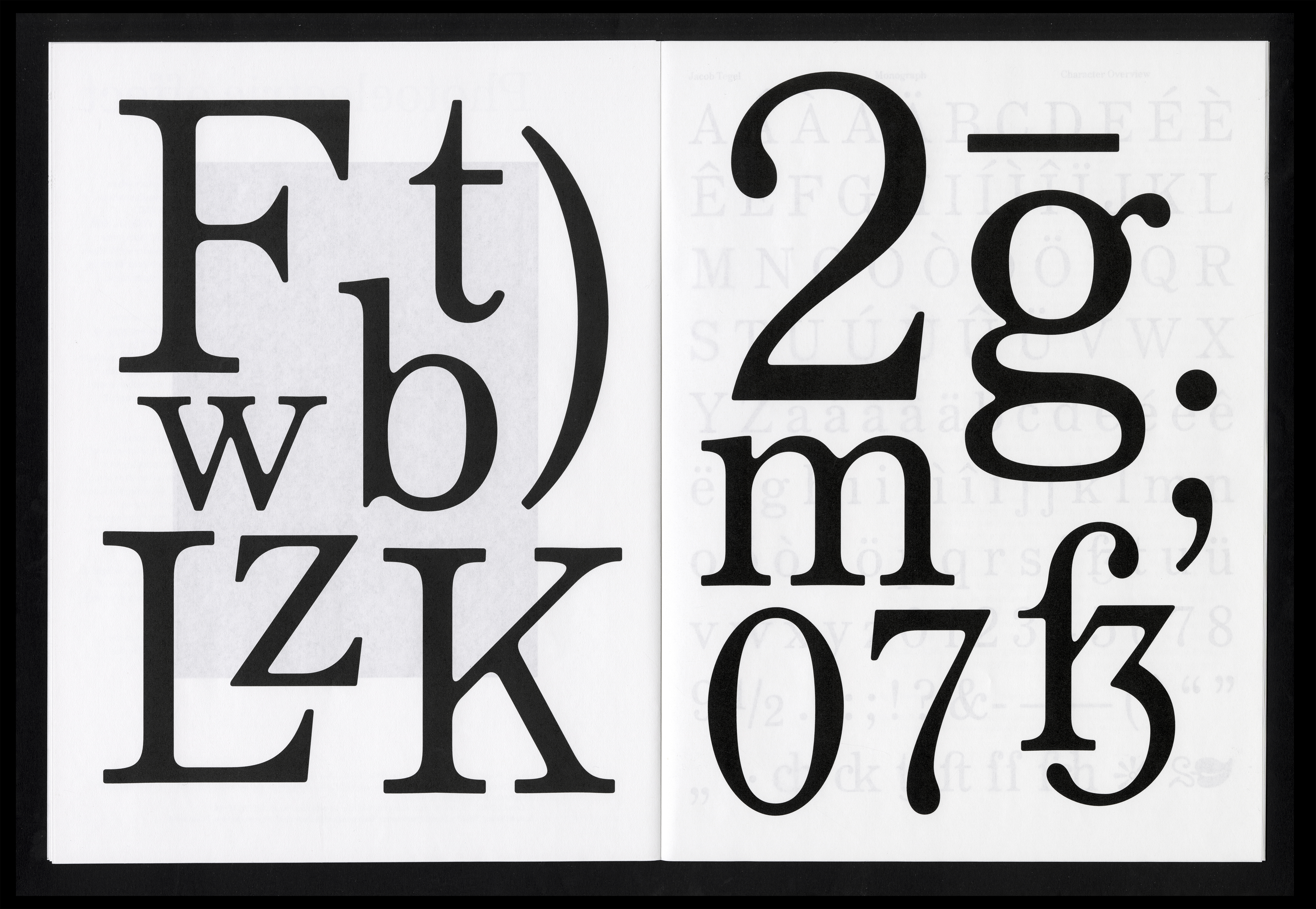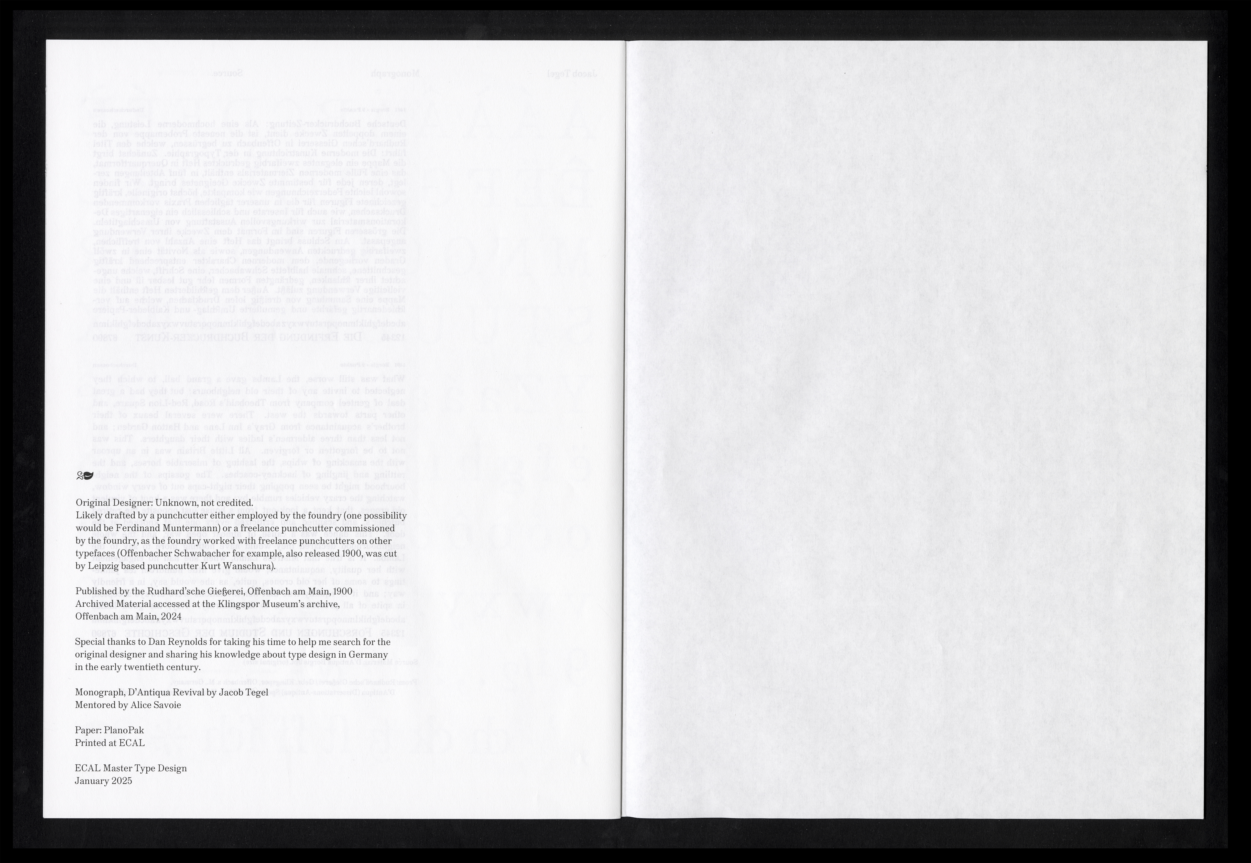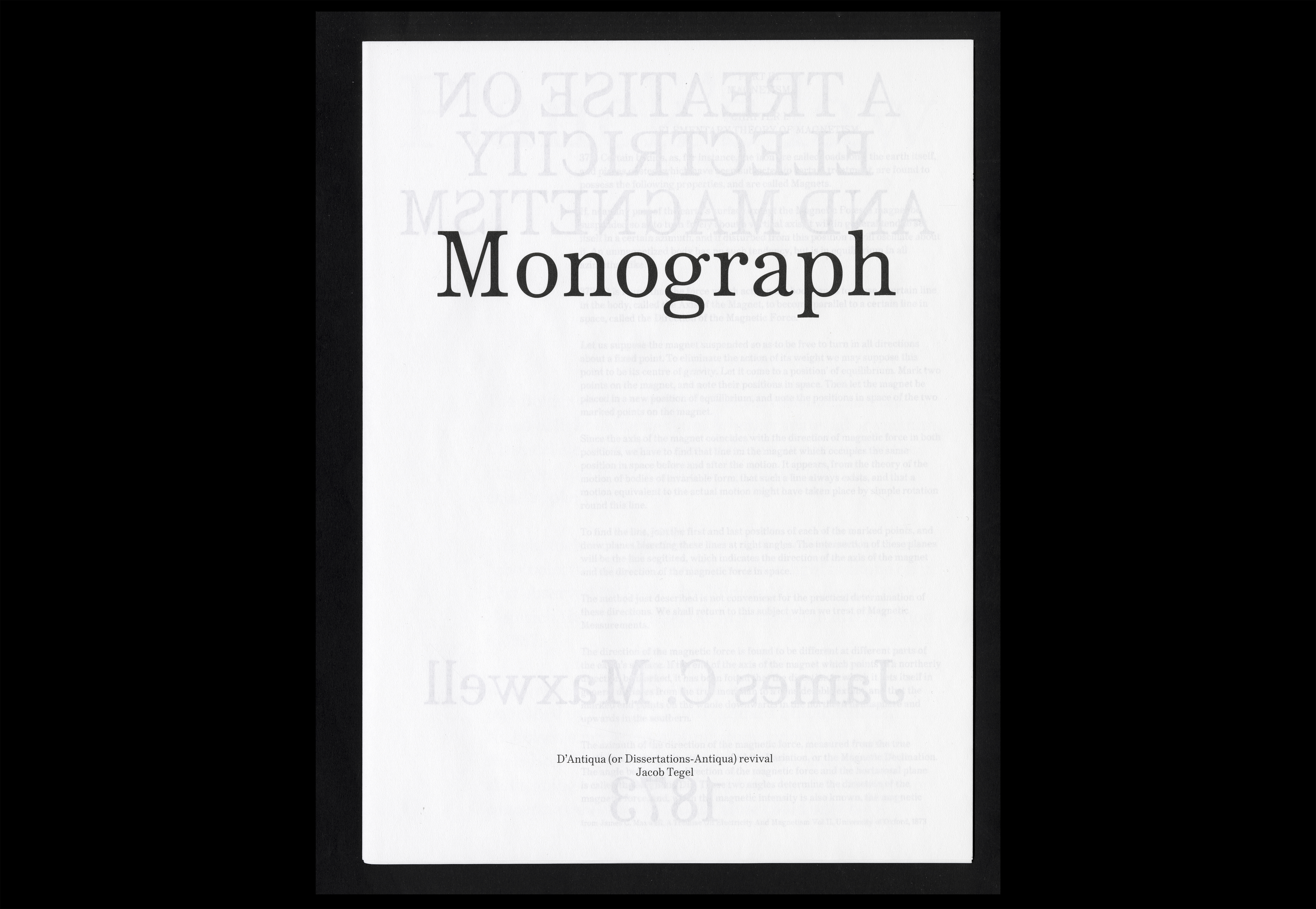 Specimen of Monograph, a revival of D’Antiqua, created during ECAL Master Type Design.